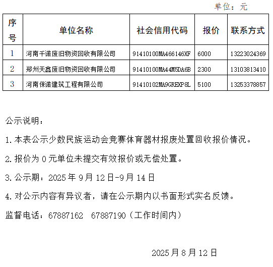 少数民族运动会竞赛用体育器材报废处置 报价公示表